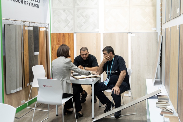 建材展位展品主要為室內(nèi)強(qiáng)化木地板、防水木地板、石塑SPC及WPC地板等。到訪客戶大多來自南美,也有部分中東、歐洲等國的新客戶。結(jié)合目標(biāo)市場(chǎng),業(yè)務(wù)部提前準(zhǔn)備了最新流行的木紋拼花地板等產(chǎn)品,其獨(dú)特的款式和顏色吸引了眾多新老客戶駐足洽談。