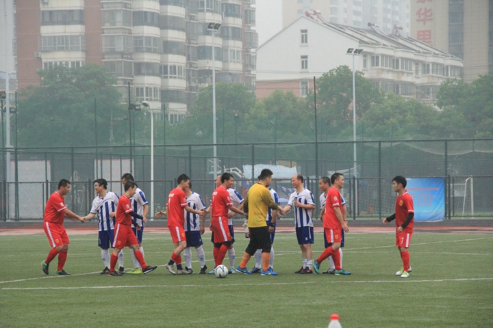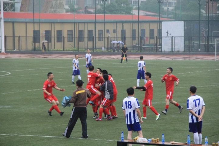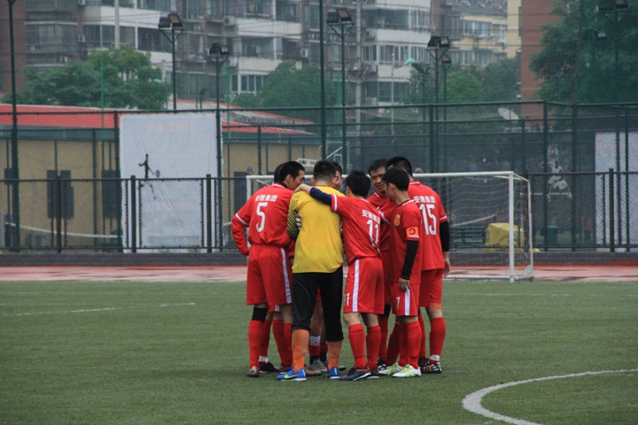 比賽開場不久,惡劣的天氣和球員的狀態(tài)不佳就讓我方遭到了懲罰,對方遠射,門將李釗不敢怠慢,奮力撲出第一點,無奈對方前鋒跟進補射得分。此后我方便開始奮力反撲,但始終不能攻破對手城池。第二節(jié),國貿聯(lián)隊的經(jīng)驗優(yōu)勢得以凸顯,他們站樁式的防守和不緊不慢的傳控,導致我方很長一段時間無法組織有效的進攻,加上我方隊員急躁的情緒,場面一度失控。休息時間全隊聚集討論,決定奮力一搏,隊長方波帶傷上陣,加強進攻。人員調整后,我方士氣明顯提升,經(jīng)過幾輪的組織,終于由徐學峰右路突破下底傳中,前點潘永博巧妙一漏,侯立峰左腳冷靜推射破門。一鼓作氣,方波角球精確助攻,對方中后衛(wèi)冒頂,侯立峰后點頭球再下一城。緊接著潘永博突破打門,對方門將脫手,方波跟進冒著左腿再次拉傷的危險,奮力將球打進,3:1鎖定勝局,全體隊員緊緊的擁抱在一起,場下啦啦隊也情緒高漲,擊鼓吶喊為安糧健兒加油。