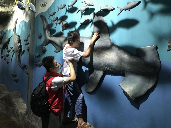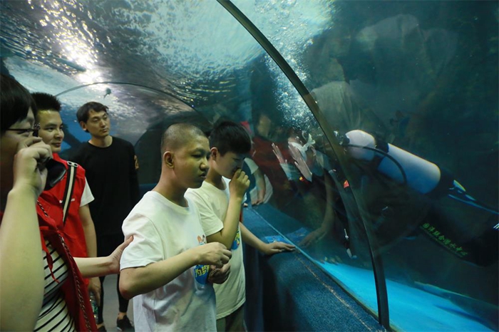 見面會(huì)結(jié)束后,志愿者們與小朋友手牽手,乘車來到合肥海洋館。珊瑚、魚兒五彩斑斕,海獅、海豚表演精彩紛呈,小朋友們因?yàn)槁犃蛞暳φ系K無法完全感受得到,但哥哥姐姐們用愛與陪伴、細(xì)心描述讓小朋友“看”到、“聽”到、感受到了世界的美好,純真的笑容背后是一個(gè)美麗多彩的世界。結(jié)束海洋館體驗(yàn),志愿者們與小朋友共同制作漢堡,共同享受了快樂的午餐。