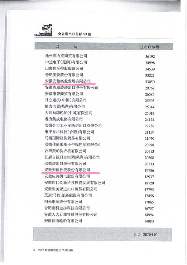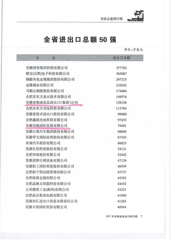 2017年全省進(jìn)出口總額50強(qiáng)排行榜出爐 安糧集團(tuán)排名第七位