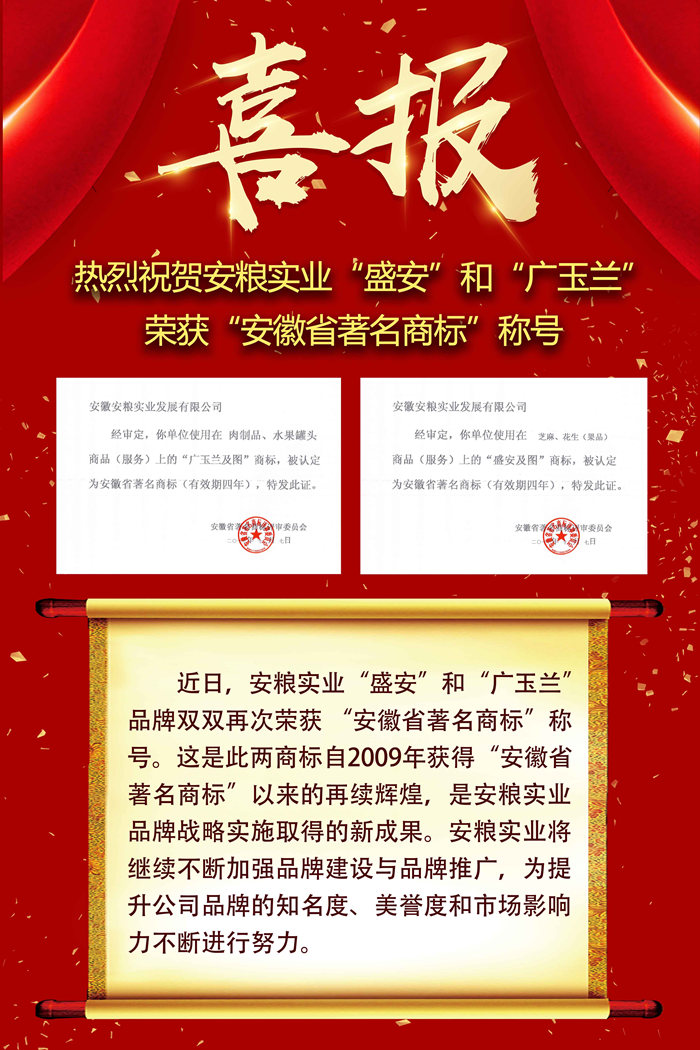熱烈祝賀安糧實(shí)業(yè)“盛安”和“廣玉蘭“ 榮獲“安徽省著名商標(biāo)”稱號