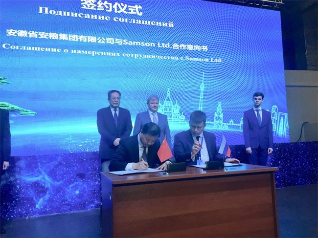 簽約儀式上,曹訓(xùn)立董事長代表安糧集團與俄羅斯知名連鎖超市Samson Ltd.代表 Ilya Chekanov 先生簽署了雙方在深化合作擴大貿(mào)易額、電商業(yè)務(wù)的拓展以及Samson公司為安糧集團橋接當?shù)刭Y源向中國進口的戰(zhàn)略合作意向書。