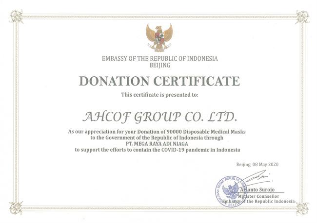 5月8日,印尼駐華大使館向安糧集團(tuán)發(fā)來(lái)捐贈(zèng)證明書(shū),以此表達(dá)對(duì)安糧集團(tuán)捐贈(zèng)印尼政府9萬(wàn)只口罩之舉的誠(chéng)摯感謝!