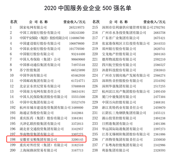 安糧集團(tuán)位列2020中國(guó)服務(wù)業(yè)企業(yè)500強(qiáng)第198位