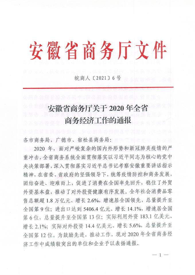 全省商務工作電視電話會議2021年1月21日上午在合肥召開。會上,省商務廳張箭廳長對2020年全省商務經濟工作中成績較突出的單位和企業(yè)予以表揚通報。