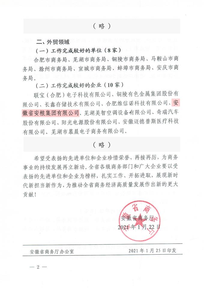安糧集團2020年以進出口額超22.46億美元(海關統(tǒng)計),增速超28.56%的業(yè)績,作為省內唯一一家入圍的專業(yè)外貿公司榮獲省商務廳的表彰。