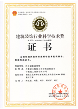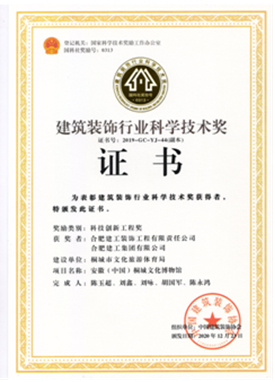 自2019年評選以來,公司申報的“安徽(中國)桐城文化博物館”項目斬獲科技創(chuàng)新工程獎一項,總結(jié)形成的施工技術(shù)成果“不規(guī)則立面齒條型GRC幕墻施工技術(shù)”獲得科技創(chuàng)新成果獎一項,走在安徽省內(nèi)裝飾行業(yè)的前沿。之后相繼獲得兩項科技創(chuàng)新工程獎:合肥市第六十八中學改擴建項目-綜合樓工程,六安市兒童醫(yī)院、金安區(qū)婦幼保健院醫(yī)療病房綜合樓裝飾裝修工程;兩項科技創(chuàng)新成果獎:“一種可開啟180度的裝飾消火栓暗門”,“ 基于3D建模技術(shù)高支模結(jié)構(gòu)與裝飾結(jié)構(gòu)共用盤扣腳手架安裝技術(shù)”。其中“一種可開啟180度的裝飾消火栓暗門”科技創(chuàng)新成果更是獲得一等獎的好成績。