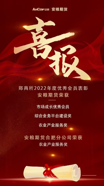 1月30日,鄭州商品交易所發(fā)布關于表彰2022年度優(yōu)秀會員的決定,安糧期貨榮獲鄭商所“市場成長優(yōu)秀會員”“綜合業(yè)務平臺建設獎”“農業(yè)產業(yè)服務獎”三項榮譽,安糧期貨合肥分公司在產業(yè)服務優(yōu)秀營業(yè)部評選中榮獲“農業(yè)產業(yè)服務獎”。