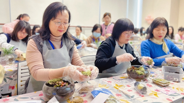微景觀是將苔蘚、多肉等植物配以砂石、泥土、玩偶裝進容器,構(gòu)成妙趣橫生的微觀世界,一個微景觀本質(zhì)上也是一個小型生態(tài)系統(tǒng)。女職工們在老師的指導(dǎo)下開始微景觀DIY活動,大家認真構(gòu)思造型,充分發(fā)揮創(chuàng)造力,不一會兒,一份份清新雅致的微景觀作品便呈現(xiàn)在大家面前。在家中、辦公室的案頭擺上一盆,勞累疲乏時抬頭瞥見那一抹綠色,仿佛跌落到一個簡單純凈的童話世界。
