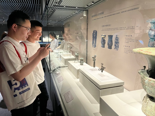 團(tuán)員青年們首先集體參觀了“三星堆?長江流域青銅文明展”。作為二十世紀(jì)人類最偉大的考古發(fā)現(xiàn)之一,三星堆遺址被譽(yù)為“長江文明之源”。通過生動詳實(shí)的介紹,團(tuán)員們深入了解了黃金面具、青銅人像等三星堆“頂流”文物,領(lǐng)略了長江流域青銅文明的歷史光輝和璀璨成就。
