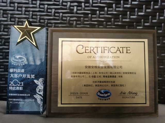 安糧實(shí)業(yè)獲得優(yōu)鮮沛品牌授權(quán),并榮獲“大客戶開發(fā)獎(jiǎng)”,不僅是對安糧實(shí)業(yè)在休閑食品原料領(lǐng)域?qū)I(yè)性的認(rèn)可,也是對我司市場開拓能力的信任。通過共享資源、互換優(yōu)勢,安糧實(shí)業(yè)與優(yōu)鮮沛將共同推動(dòng)休閑食品行業(yè)的發(fā)展,為廣大消費(fèi)者帶來更多美味、健康的休閑食品,未來安糧實(shí)業(yè)與優(yōu)鮮沛的合作會(huì)讓更多客戶采購到高品質(zhì)休閑食品原料和新鮮蔓越莓產(chǎn)品。