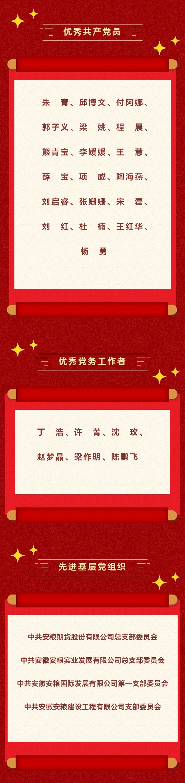 為大力弘揚(yáng)黨的優(yōu)良傳統(tǒng)和作風(fēng),激勵各級黨組織和廣大黨員更加深刻地領(lǐng)悟“兩個確立”的決定性意義,更加自覺增強(qiáng)“四個意識”、堅(jiān)定“四個自信”、做到“兩個維護(hù)”,努力營造見賢思齊、爭做先鋒的良好氛圍。近日,安徽國貿(mào)黨委對優(yōu)秀共產(chǎn)黨員、優(yōu)秀黨務(wù)工作者和先進(jìn)基層黨組織進(jìn)行了表彰,安糧集團(tuán)19名優(yōu)秀共產(chǎn)黨員、6名優(yōu)秀黨務(wù)工作者和4個先進(jìn)基層黨組織獲得榮譽(yù)。