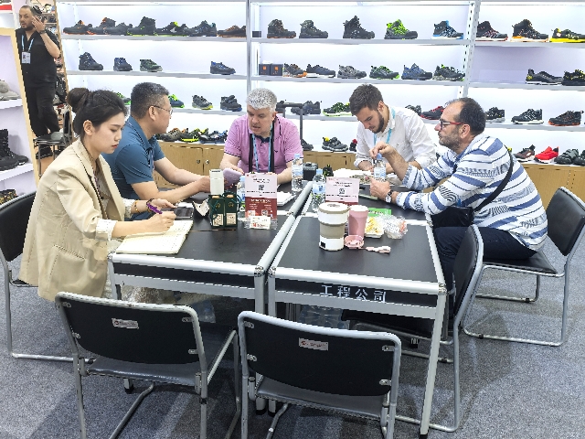 鞋類展區(qū)以“創(chuàng)新科技,時(shí)尚出行”為主題,集中呈現(xiàn)了運(yùn)動(dòng)休閑、戶外功能等多類產(chǎn)品。主打的輕便安全鞋采用先進(jìn)的減震與防護(hù)技術(shù),兼具輕量化與高強(qiáng)度特性,獲得歐美客戶的高度認(rèn)可,開展首日就迎來大量客戶詢價(jià)洽談;使用環(huán)保耐磨材料制成的雪地靴,憑借出色的保暖與防滑優(yōu)勢(shì),成為北歐市場(chǎng)的潛力爆品。
